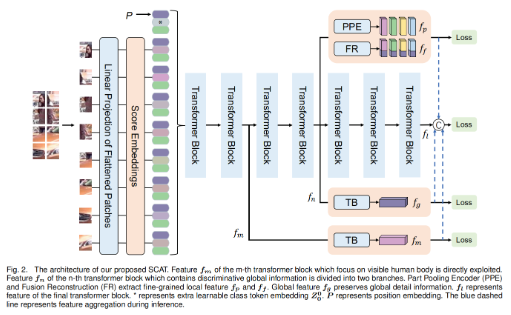 科研人員針對這一問(wèn)題提出了一種基于Transformer注意力機制的遮擋行人重識別算法。研究中發(fā)現在利用Transformer提取行人特征時(shí),淺層網(wǎng)絡(luò )提取的特征分布在局部目標區域;中間層網(wǎng)絡(luò )的注意力集中在可見(jiàn)行人部分;高層網(wǎng)絡(luò )的注意力聚焦全局行人特征?;谶@一發(fā)現,研究團隊提出了跳連接聚合Transformer網(wǎng)絡(luò )(SCAT),利用中間層特征、高層特征和細粒度局部特征來(lái)增加特征多樣性,提升遮擋行人目標的重識別精度。在多個(gè)數據集上驗證了所提方法的有效性,包括遮擋數據集、部分數據集和全身數據集。