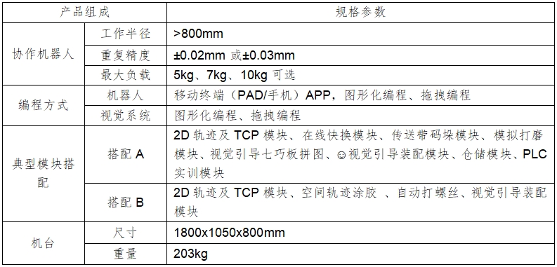 ?2D軌跡及TCP模塊 ?在線(xiàn)快換模塊 ?傳送線(xiàn)碼垛模塊 ?模擬打磨模塊?視覺(jué)引導七巧板拼圖模塊 ?視覺(jué)引導裝配模塊 ?倉儲模塊 ?PLC實(shí)訓模塊?繪畫(huà)模塊 ?在線(xiàn)分揀模塊(可選2D&3D視覺(jué)及RFID) ?模擬打磨模塊
