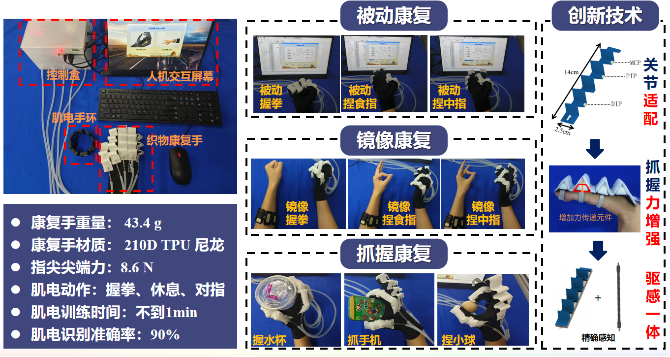 肌電交互織物康復手:利用柔性織物與肌電控制系統構建肌電交互式織物康復手,重量輕,驅動(dòng)力大,交互性強,為卒中患者提供手部多方式有效訓練。