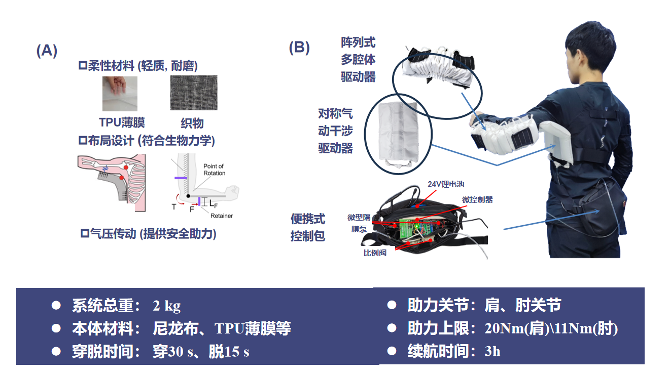 基于柔性織物的上肢運動(dòng)輔助系統:可以實(shí)現肩部和肘部的協(xié)同輔助運動(dòng),降低肌肉活動(dòng),具有本質(zhì)安全、輕質(zhì)柔順以及機械透明特性
